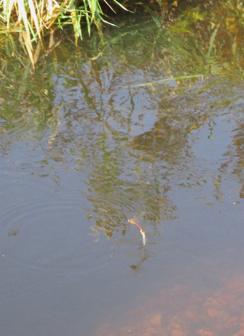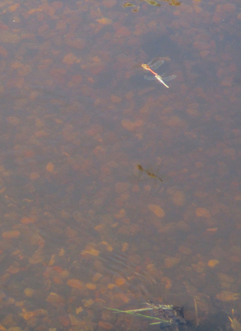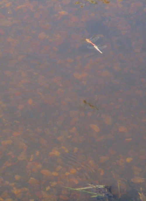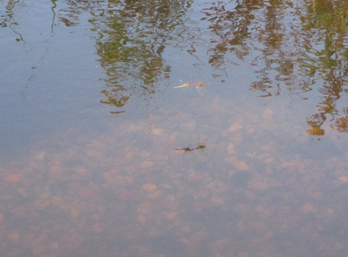 Um welche Art es sich handelt, blieb mir schleierhaft. Ähnlich rote Männchen kenne ich von solcherart Bächen als Blutrote Heidelibelle. Hier – unscharf, ungenau erkennbar – scheint mir das Weibchen aber bläulich auszusehen, nicht wie für die Heidelibelle beschrieben. Für Hinweise auf eine andere Art bin ich dankbar. – P.S.: Ich danke „Puzzleblume“ herzlich, s. unten in Kommentare.
