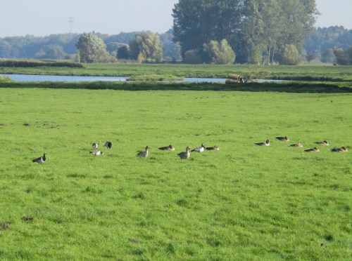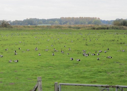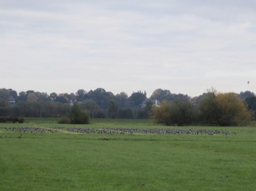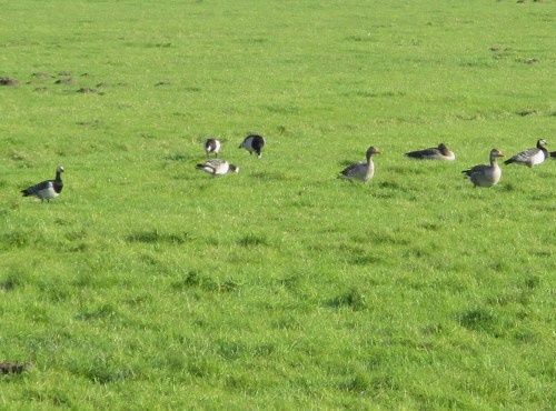Ende September, Anfang Oktober, als noch Hunderte Graugänse die Marsch bevölkerten, stutzen wir. – DA … haben sich doch einzelne Nonnengänse bereits eingeschlichen.