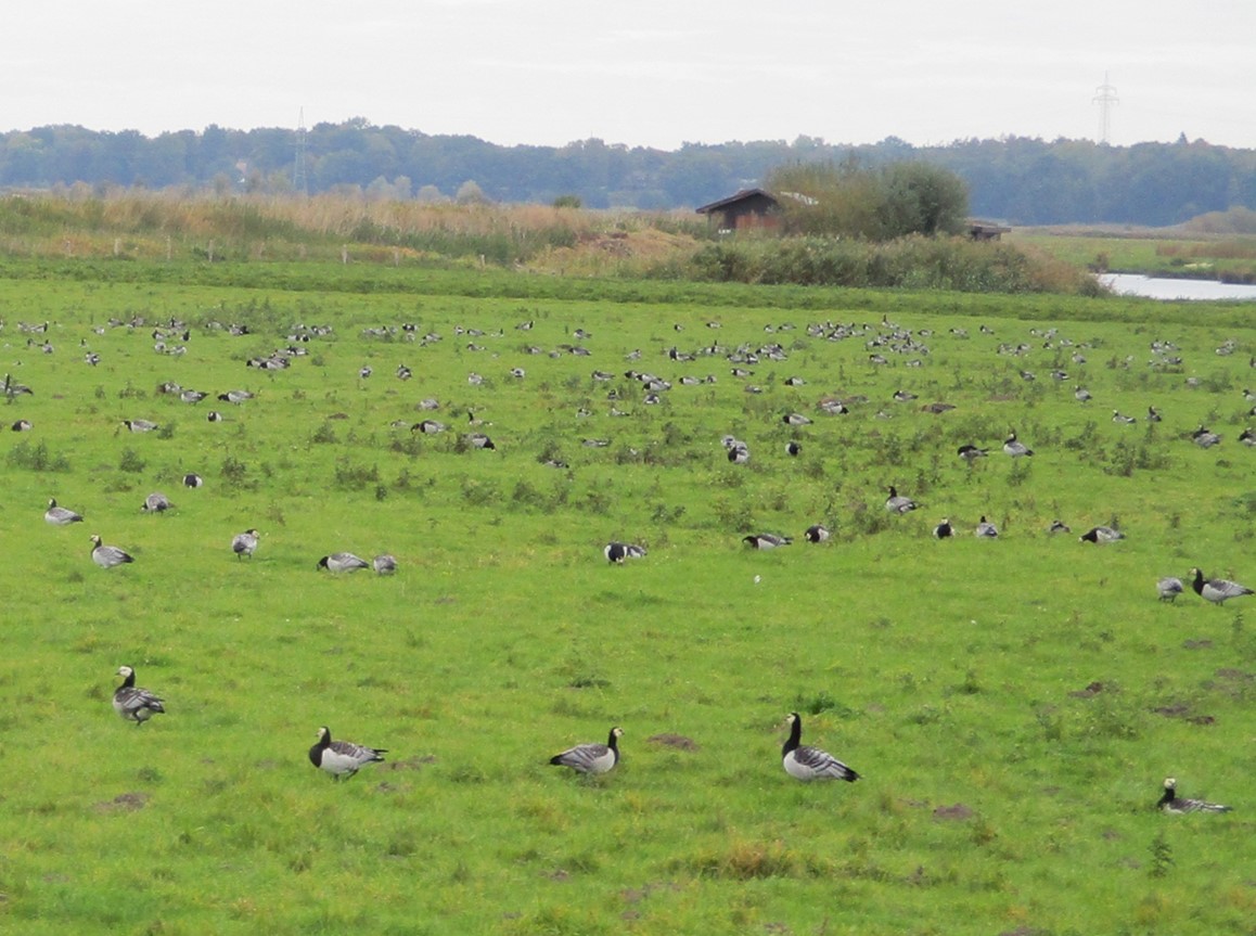 Ende September, Anfang Oktober, als noch Hunderte Graugänse die Marsch bevölkerten, stutzen wir. – DA … haben sich doch einzelne Nonnengänse bereits eingeschlichen.
