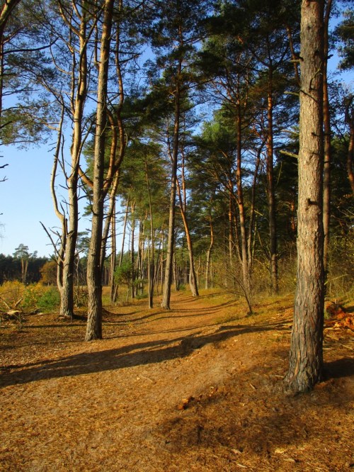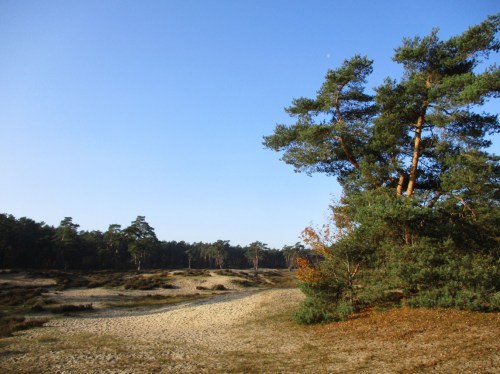 Einige Teilflächen der Holmer Sandberge sind von Baumbestand befreit worden, damit die Dünenlandschaft erkennbar wird. Wir stehen am Morgensonne-beleuchteten Waldrand.