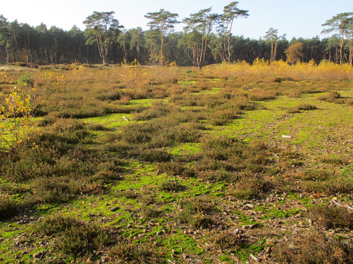 Das Freihalten ist eine ständige Aufgabe, da die Natur über wetter- und standortabhängige zeitliche Abfolge gezielt Richtung Wald arbeitet. – Erste Ansätze Moos und Birkenanflug neben Heide sind hier erkennbar.