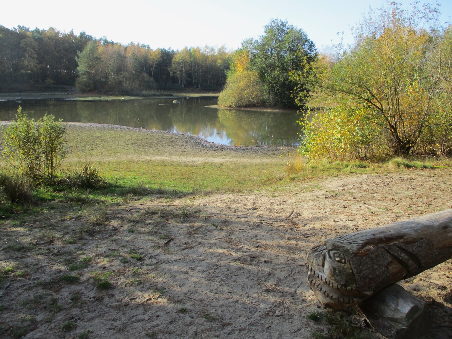 Am das derzeitige Wasserschicksal anzeigenden, um ca. 1,5 m zu wenig gefüllten Feuerlöschteich steht vorndran ein grimmiges Holzungeheuer.