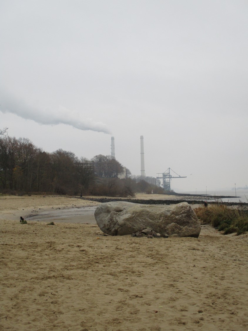 Blick über Wedels alten Schweden (der wurde „Fährmannsstein“ benannt) Richtung Kohlekraftwerk, schnellere Stilllegung wünschenswert. Das Kondenswasser mit Rauchfahne zeigt steifen Südostwind an.