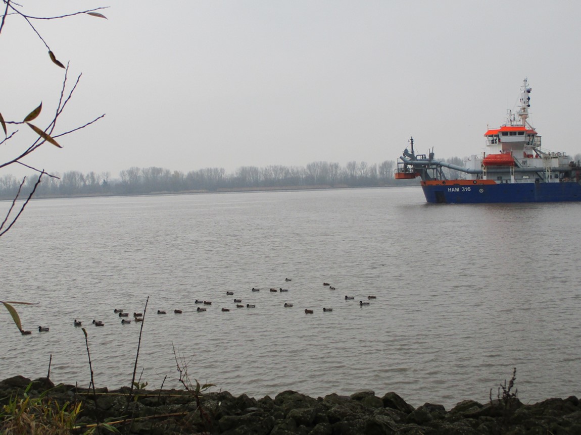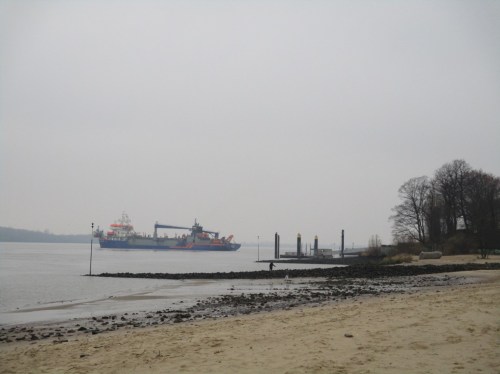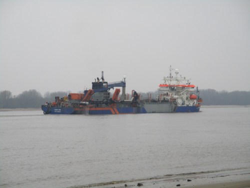 Wie bei marinetraffic.com später zu sehen ist, baggert der hier am Elbhang und verklappt seine Fracht derzeit bei Brokdorf.