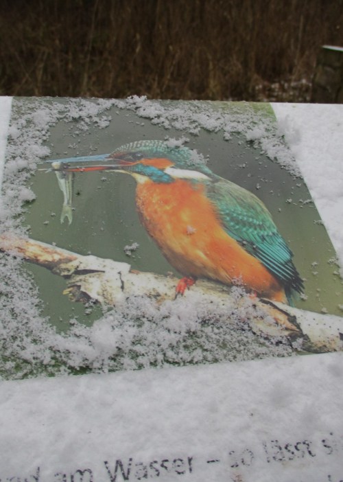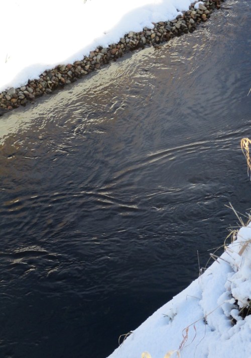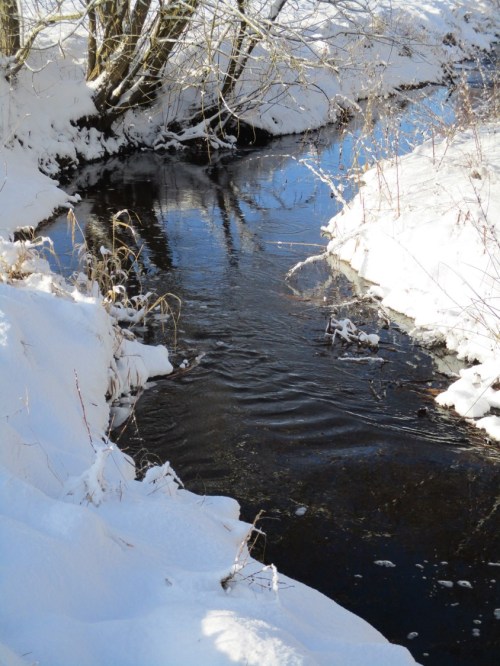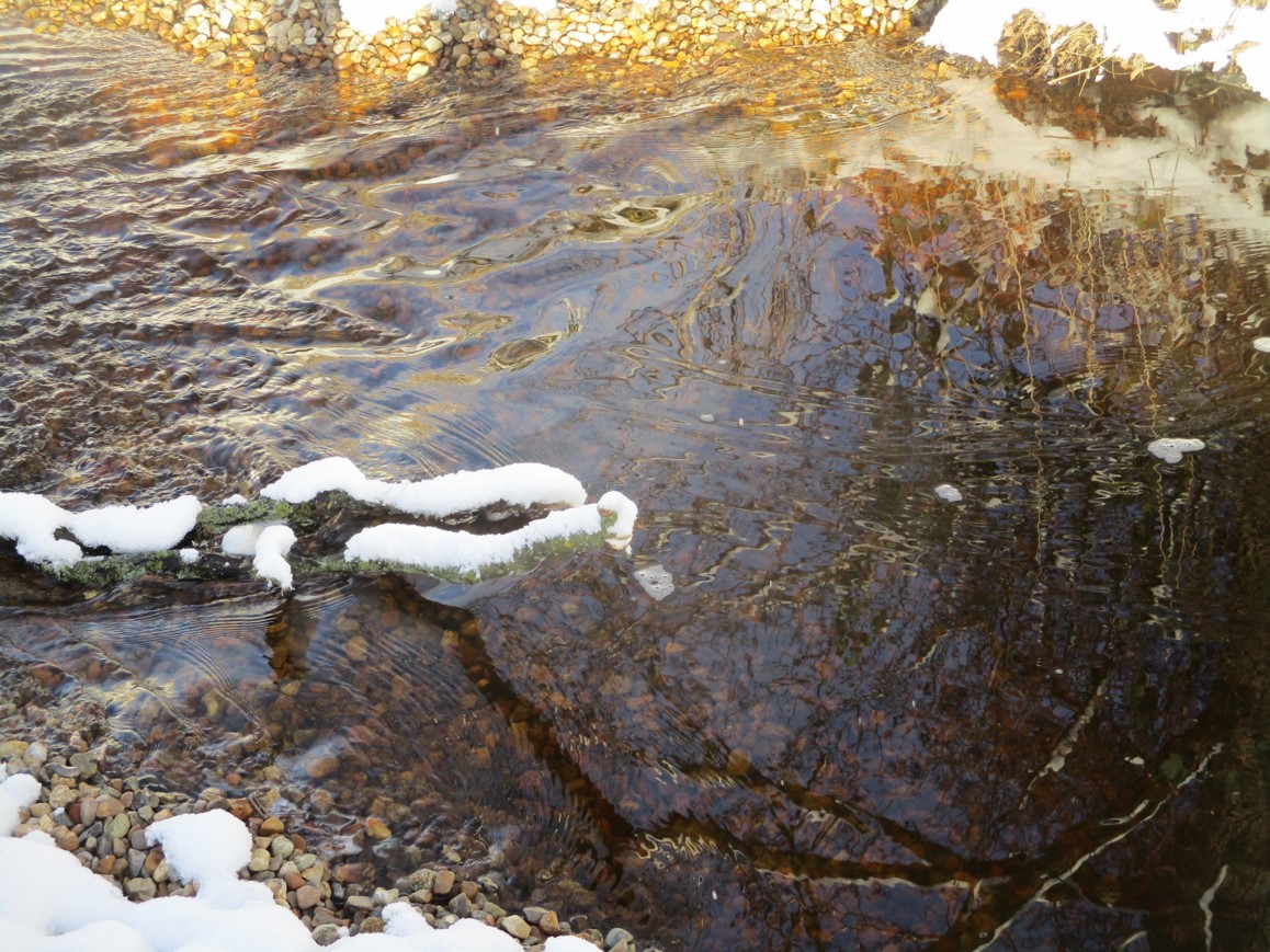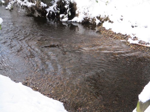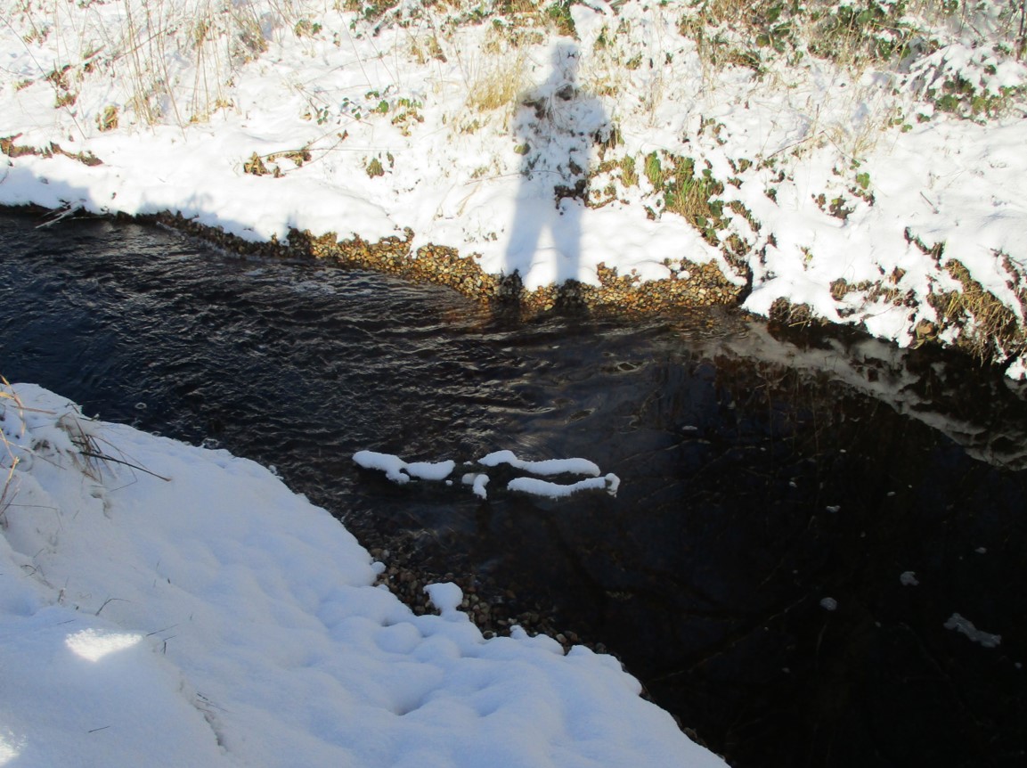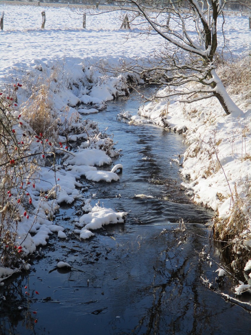 Es hat geschneit, die Sonne lacht. Ich meide Rodelberge und besuche eine seit 2017 nach und nach restaurierte Bachstrecke. Über die Lebensverbesserungen für Wirbellose und Fische hatte ich berichtet.