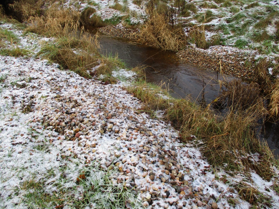 Hier hat Natur Kleinlandschaft verändert, neu geschaffen. Meerforellen haben den Anstrom der Rausche beim Laichen – Losschlagen von Kies, Transport durch Fisch und Bachströmung – aufgehöht. Da, im „Berg“, liegen die Eier drin.