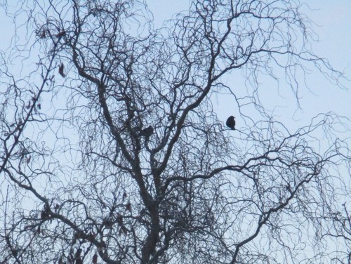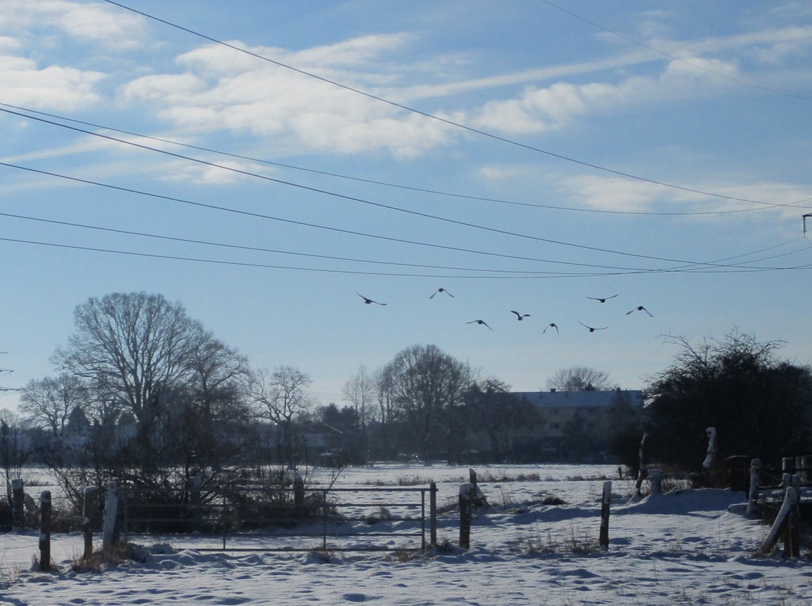 8 Stockenten ziehen ab. Angesichts gefrorener Stillgewässer ziehen die Vögel in offenere Gefilde zur Nahrungssuche. Hier bei uns sind das z.B. die „winterwarmen“ Bachläufe – durch Quellen gespeist, mittlere Bodentemperatur aufweisend (kleine Erinnerung: zu „winterwarm“ gehört „sommerkühl“).
