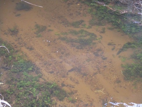 Bei näherem Hinsehen ist uferseits, rechts oben, ein kleines Laichbett erkennbar – wohl von einem Bachforellenpaar.