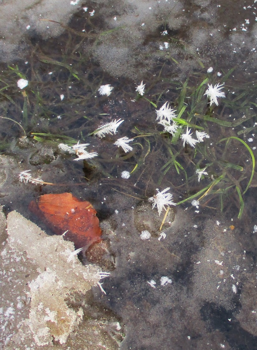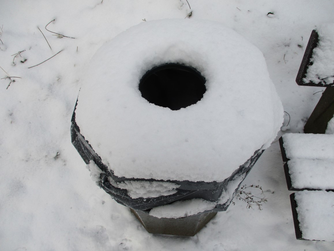 Idyllisch verschneit und beschienen, der Kaulquappen- und Molchteich – vgl. frühsommerliche Beiträge hier im Blog.