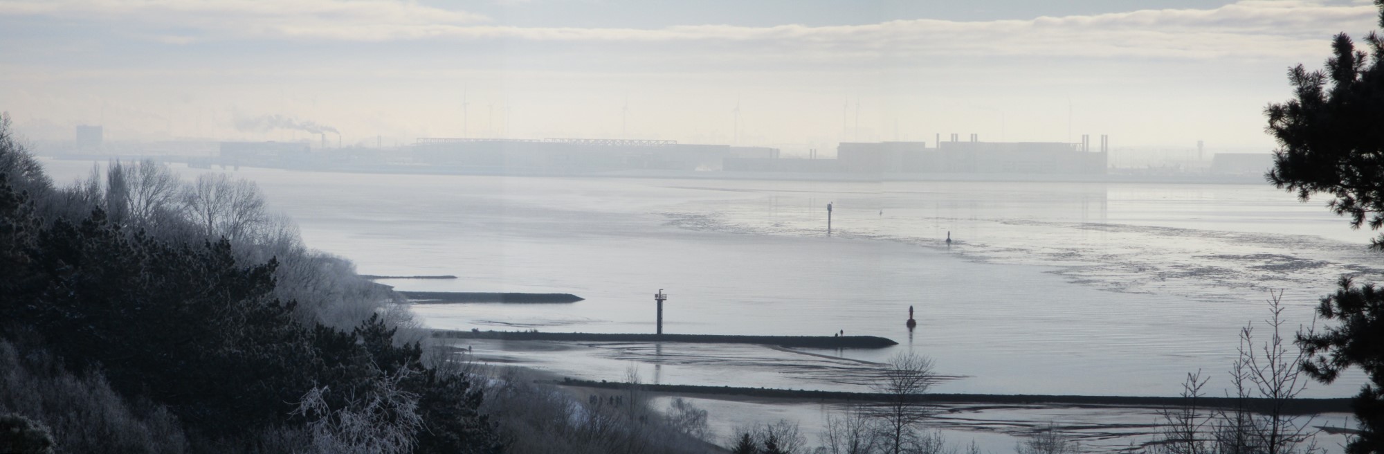 Fahrwasser der Elbe, Neßsand, Estemündung im (ehemaligen Flachwassergebiet, nun) Süßwasserwatt Mühlenberger Loch, Werft, Harburger Berge, noch im Dunst, verschluckt.