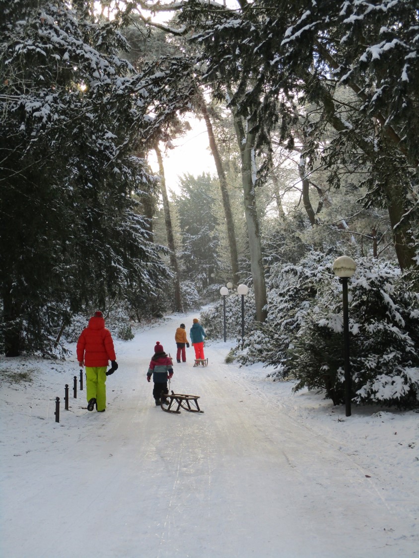 Jeglicher, dünn schneebedeckte Hang ringsum (weiter nordwestlich, im Holsteinischen – wohl auch im Niedersächsischen – die Deiche) ist inzwischen heftig berodelt worden. Die Medien berichten von teil- und zeitweisen Sperrungen, da Überfüllung drohte bzw. bereits eingetreten war.