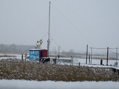 Blick über Wedeler Au und Marsch – hinter Nordostwind-geducktem Reet liegt das Theaterschiff Batavia, versteckt.