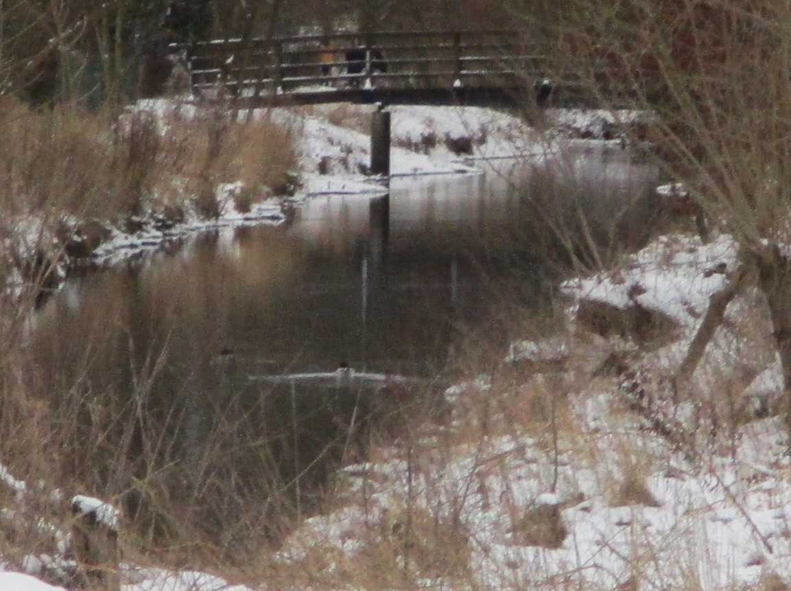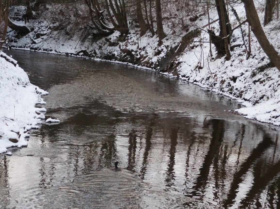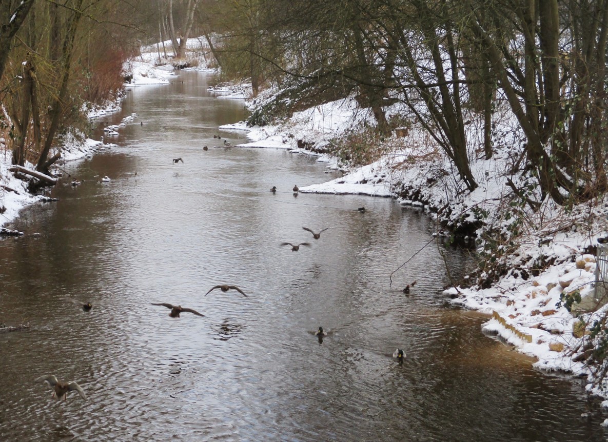 Es friert seit geraumer Zeit ordentlich. Die Stillgewässer sind eisbedeckt und zur Futtersuche durch Vögel nicht mehr zugänglich. Da ziehen die Schlauen weg, Spezialisierte suchen naheliegende Chancen, wie z.B. die winterwarmen (sommerkühlen) Bachoberlaufstrecken. Die Mühlenau, Pinnau-Einzugsgebiet, gehört auf ganzer Länge bis zur Einmündung in die Pinnau dazu.