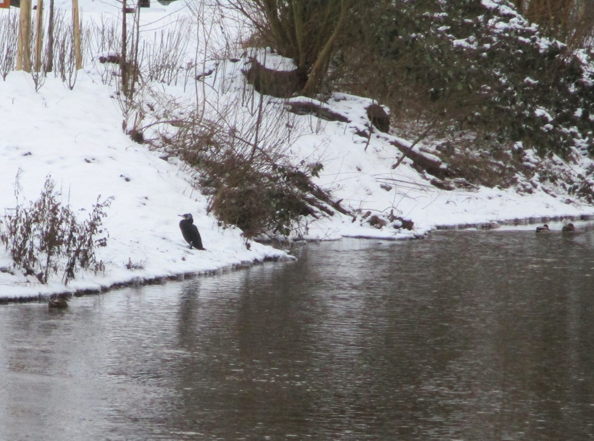 Am B-Plan Mühlenauquartier, bachab Christiansenweg, sitzt ein Kormoran. Wenn ich den „dicken Hals“ richtig deute, will oder kann der nicht abfliegen, muss erstmal ein Bisschen verdauen.