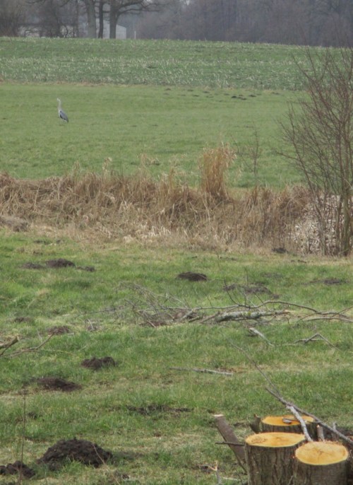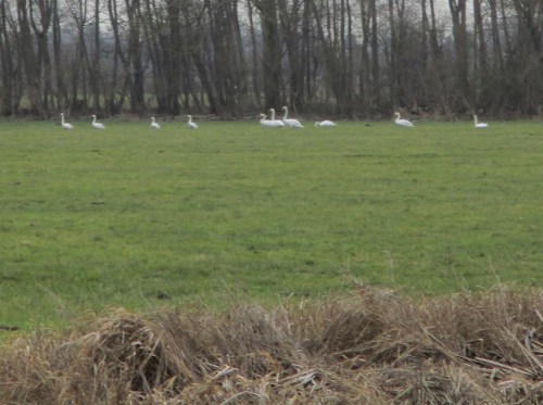 Einzig eine Gruppe Kraniche, die unmittelbar am Bach auf Grünland stand, flog auf. Die Tiere gesellten sich zu einer weiteren, entfernter an einem Knick rastenden Gruppe.