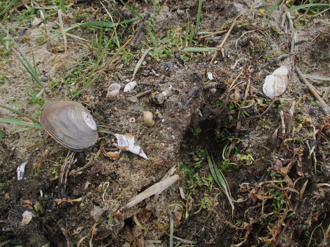 Spuren der Mähkorb-Gewässerunterhaltung – viele Schneckenarten und die im vorigen Artikel beschriebene Muschel Anodonta lagen gelegentlich, verstorben, am Uferrand.