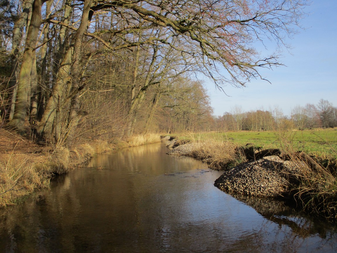Am 14. Dezember berichtete ich über die Gestaltung erster unter Wasser vor den Depots angelegter Flächen. Am Vorweihnachtstag kam dann Niederschlag, der erstmals die Mittelwassermarke wieder erreichte, danach (ein Bisschen) Schnee, Regen, nochmal Schnee, Schneeschmelze. – Es sollten also inzwischen Veränderungen durch die Krückau erkennbar sein, die weiteres, notwendiges Handeln Richtung lebendiger Bach erkennen lassen.