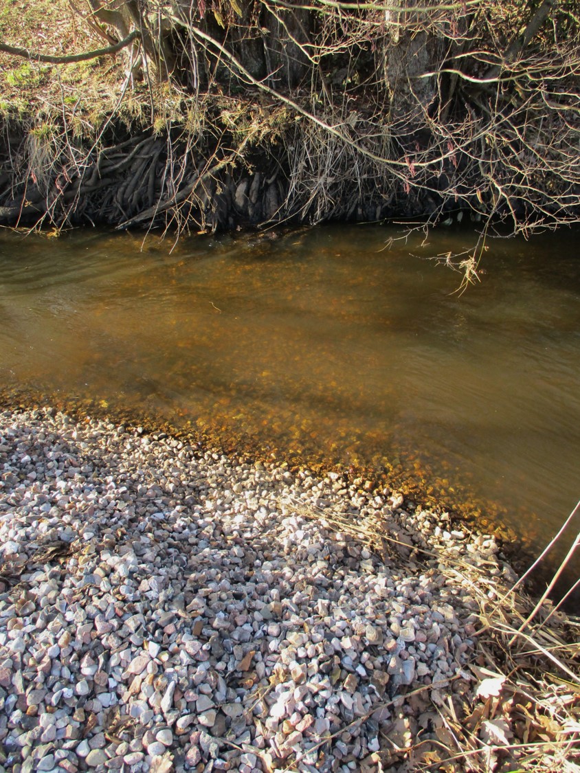 Ich gehe am Ufer bachauf, schiebe mit dem Stiefel kleine, unter Wasser angelegte Winkel zur Strömungsveränderung auf die Kiesfläche.