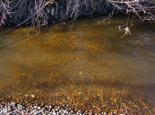 Bei näherem Hinsehen ist uferseits, rechts oben, ein kleines Laichbett erkennbar – wohl von einem Bachforellenpaar.