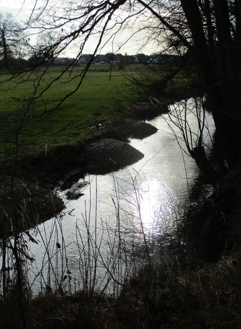Letzter Blick nach Queren der Krückau bachab – noch unberührte und veränderte Kiesschüttungen bieten eine interessante Ufervariation im Gegenlicht.