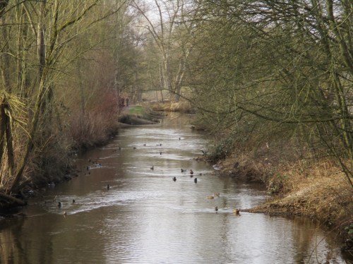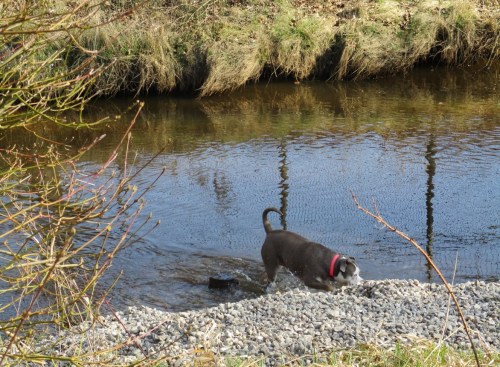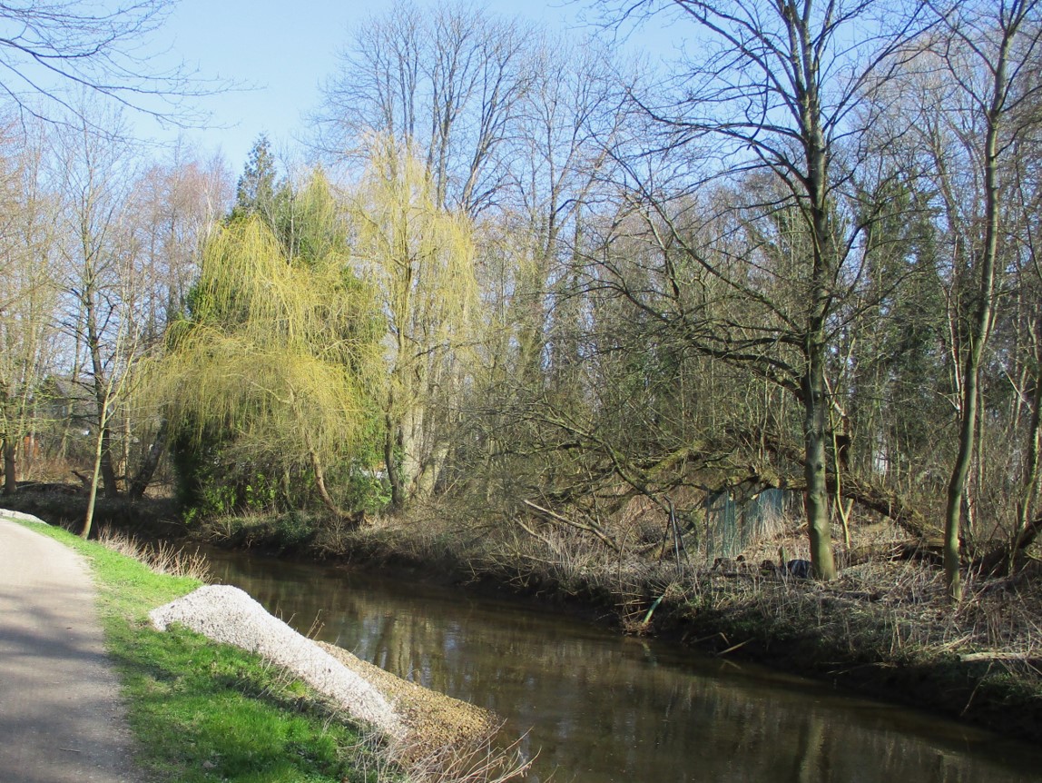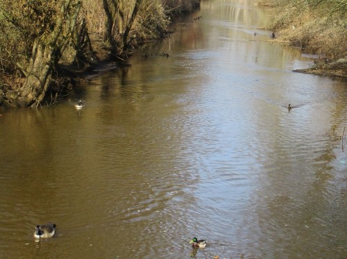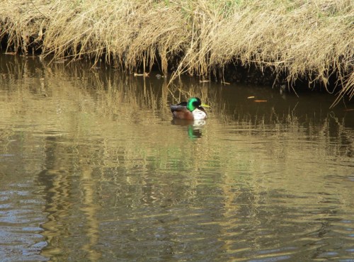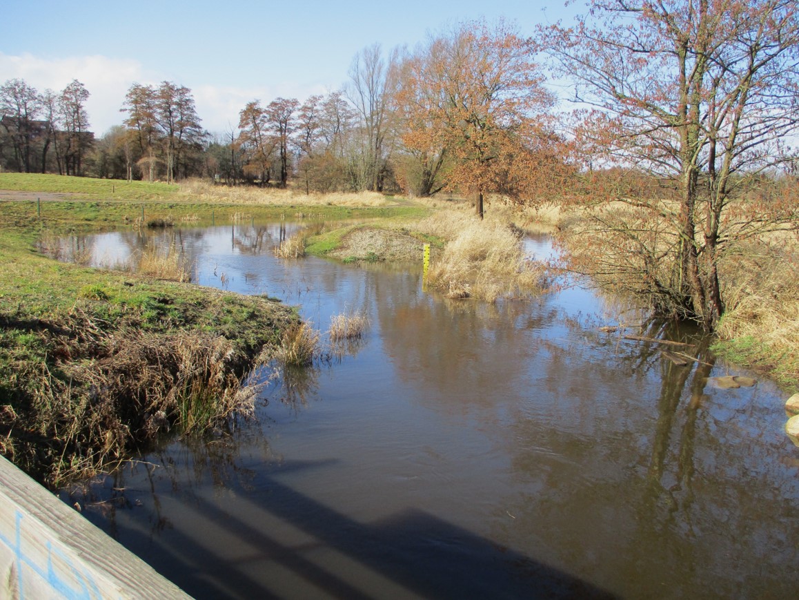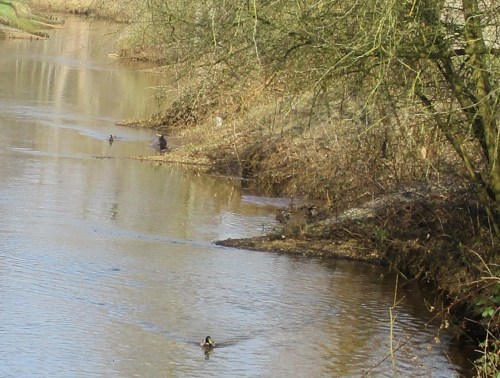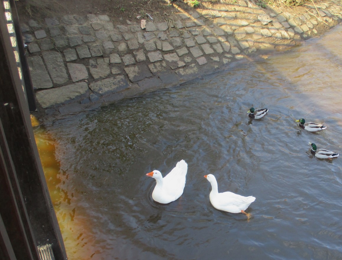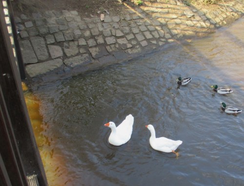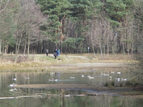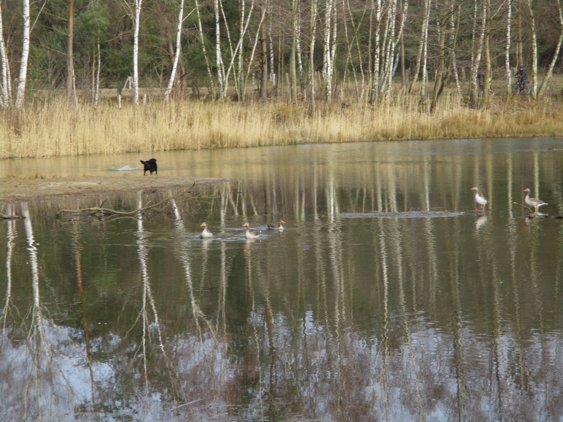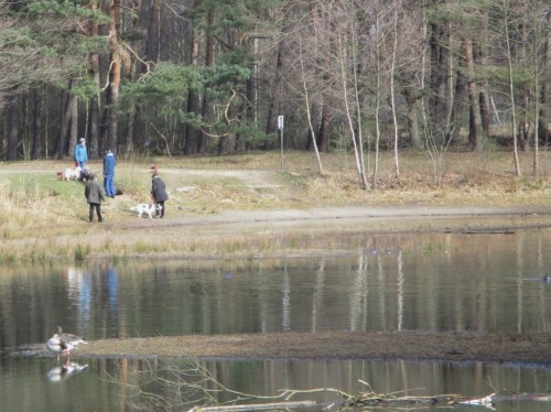 Sich beobachtet fühlende Hundebesitzer sehen die Kamera, leinen die Hunde an. – Die Wasservögel haben ihre Aktivitätsflächen verlassen.