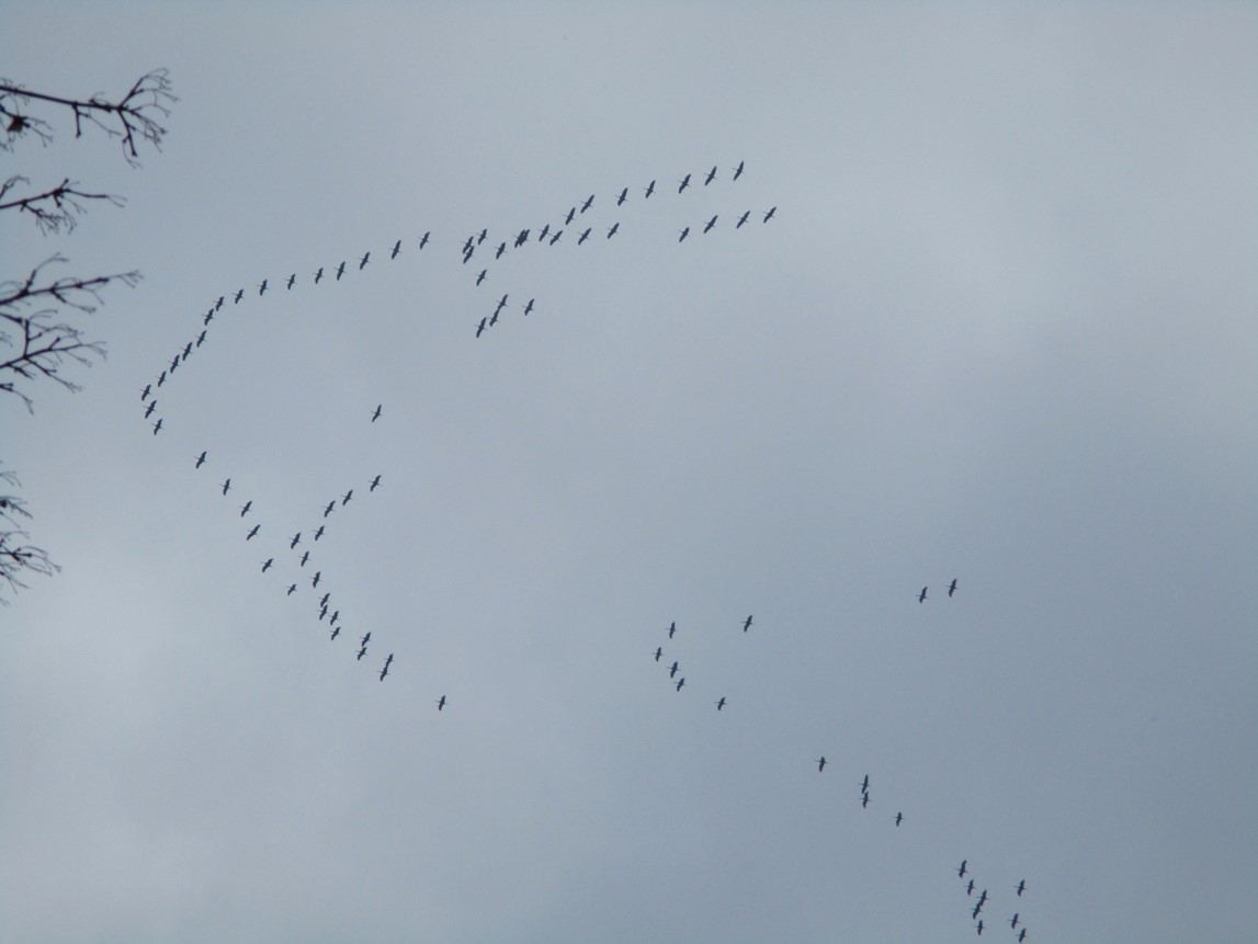 Direkt über uns, im bebauten Raum Wedels, zieht ein großer Trupp Kraniche zielgerichtet gen Nordost.