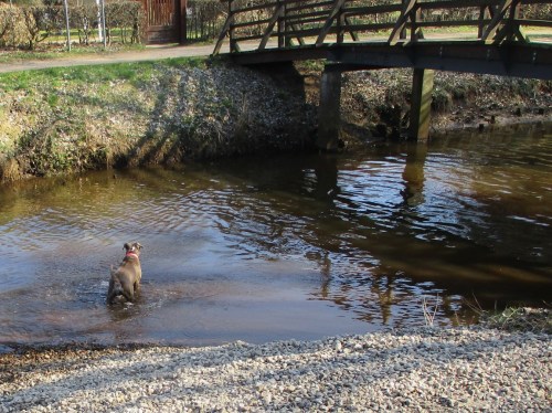 Im Blog vom 27. März hatte ich berichtet, dass ein dicker Hund den frisch angelegten Unterwasserlenker für sich entdeckt hatte. Auf meine Bitte, den nächsten Kies für Wasserspiel zu nutzen, hatte ich dann freie Bahn.