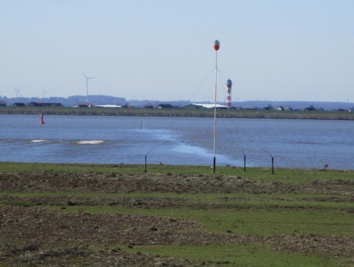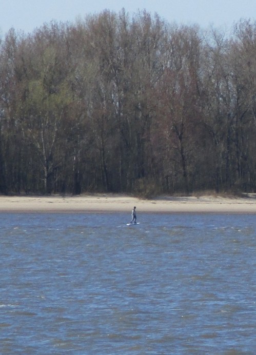 Noch ein Wahn? Mir scheint, da fährt vor der Elbinsel ein motorisiertes Surfbrett mit Standup-Survival-Kapitän bei schnellem Ebbstrom noch schneller seewärts.