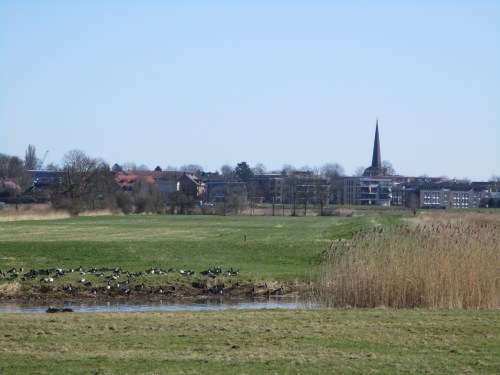 Blick zur Geest – ein kleiner Trupp Nonnengänse rastet an der Binnenelbe (noch „hohes Wasser“ angesichts erst kurz laufender Ebbephase).