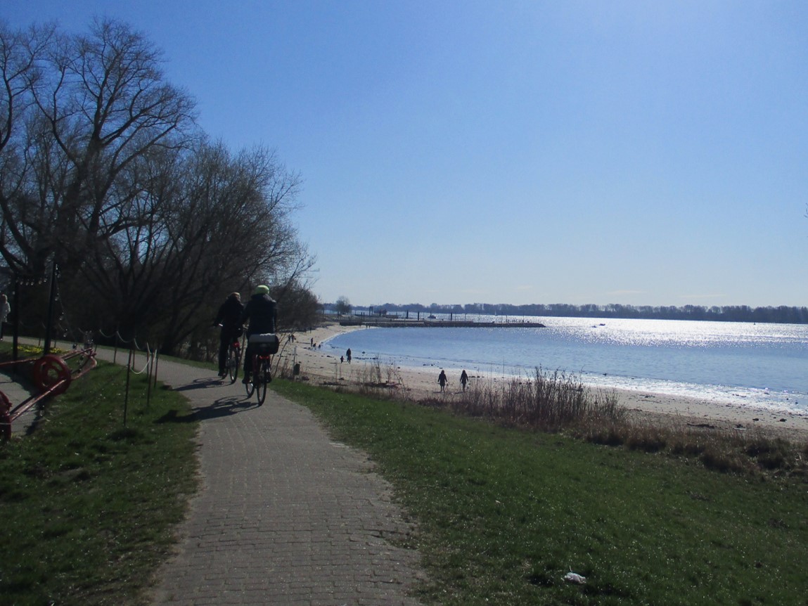 Wir radeln Richtung Elbe, wollen dicht am Fahrwasser vor dem Yachthafen Wedel eine freie Bank suchen.