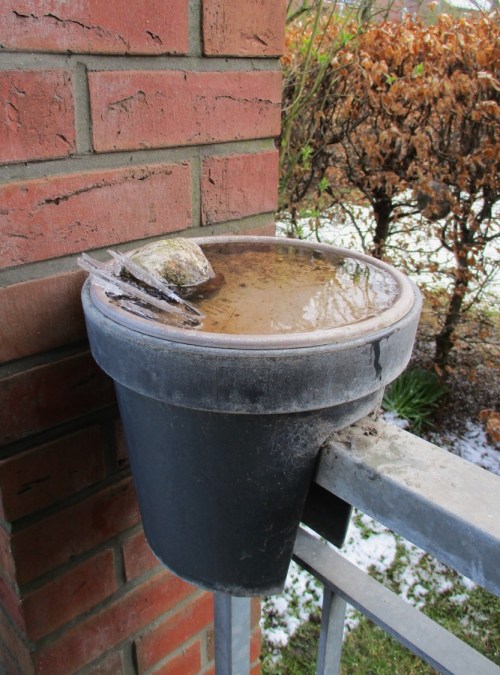 Der Wind hatte die Vogeltränke fast trocken geblasen. Das Restwasser war überfroren – hier ausgeräumt und neu gefüllt.