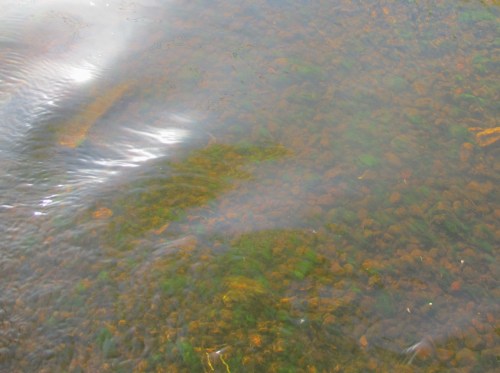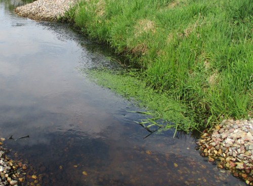 Auch „Altlasten“ sind weiter vorhanden, hier „fett“ Algenschmier auf Wasserpest, vorwiegend gesteuert durch Lichtüberschuss, wo standorttypischer Baumsaum am Ufer fehlt.