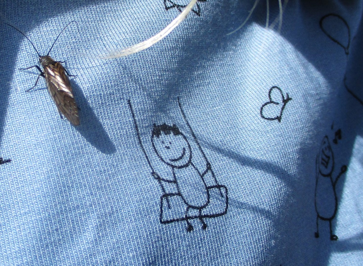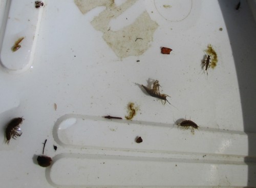 Neben den gut verbreiteten Bachflohkrebsen, als Blatt-Schredderer wesentlicher Start der Bach-Nahrungskette, sind einzelne Eintagsfliegen vor Ort. Ihre dunkle Farbe zeigt, dass sie kurz vor Wechsel ins Erwachsenenstadium stehen, das Wasser bald verlassen.