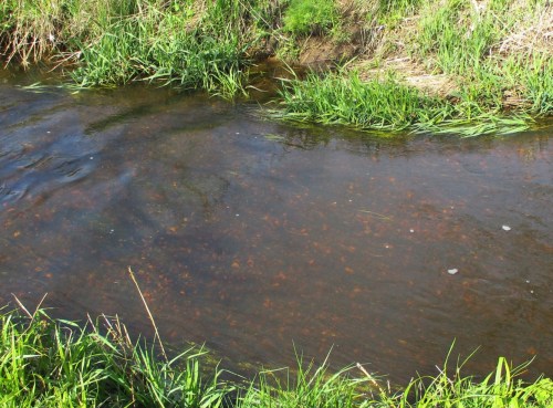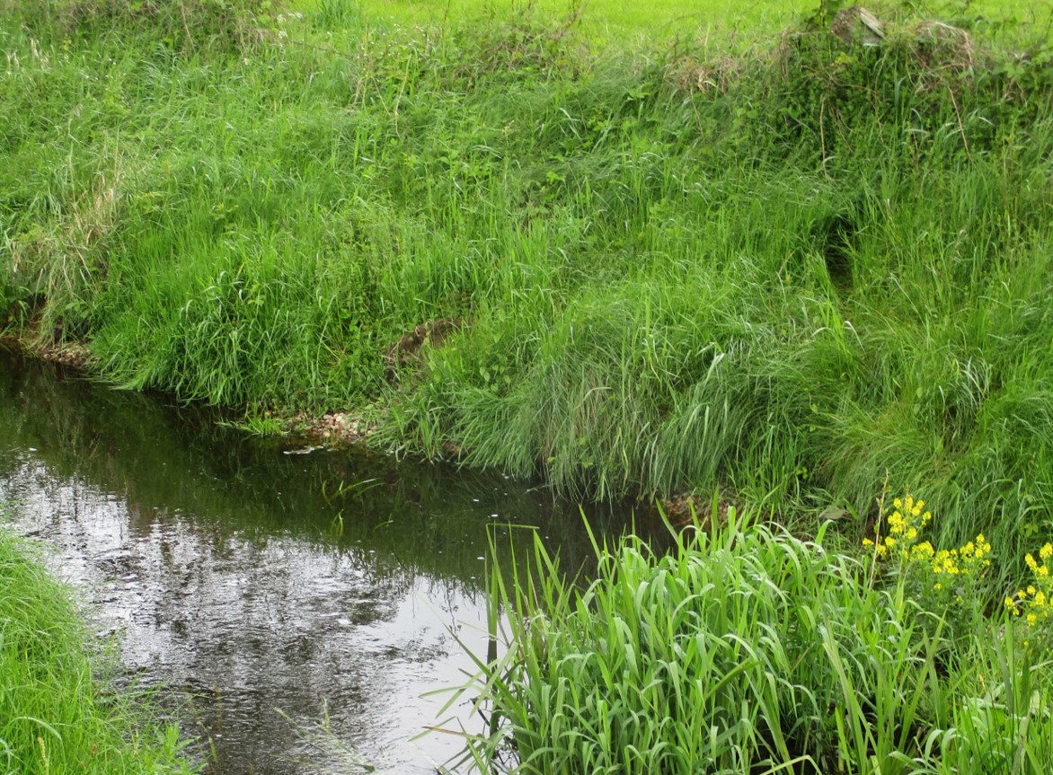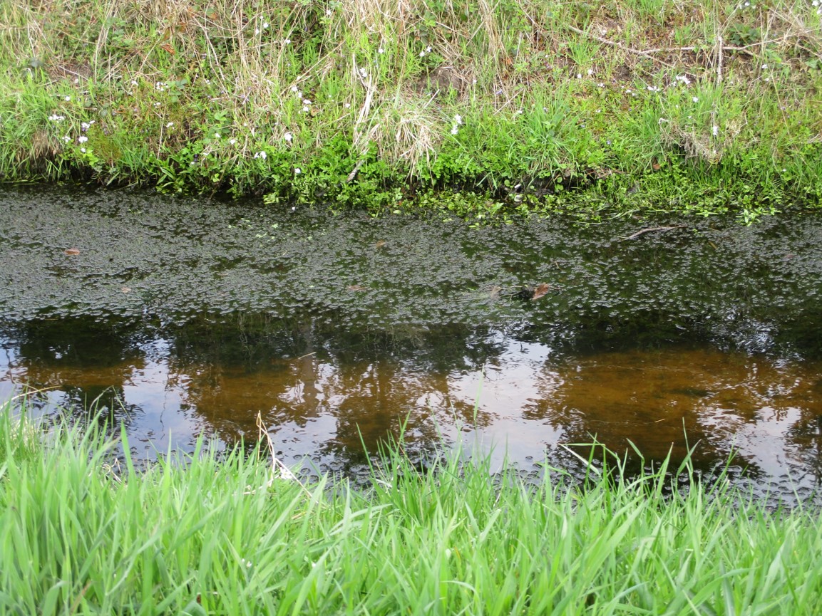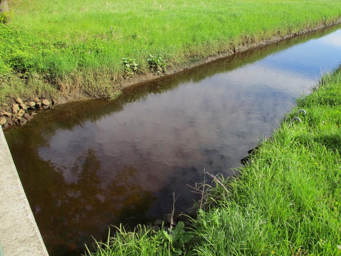 Eine nicht bearbeitete Teilstrecke – Wasserpest, sie macht ihrem Namen in übersonnten, untypisch still fliessenden Bach-Ruinen alle Ehre, setzt auf Übernahme der gesamten Bachbreite. Der Ruf nach Ausmähen wird folgen.