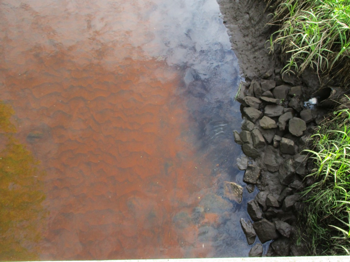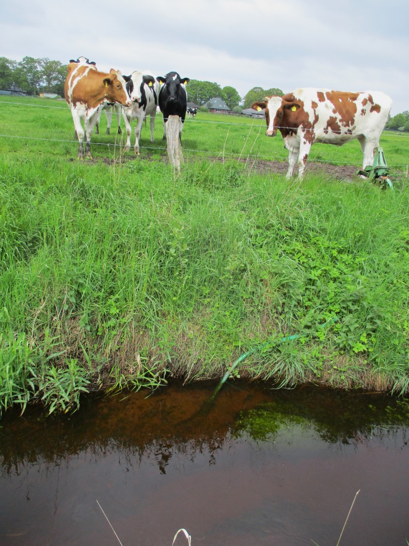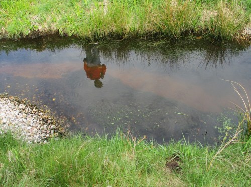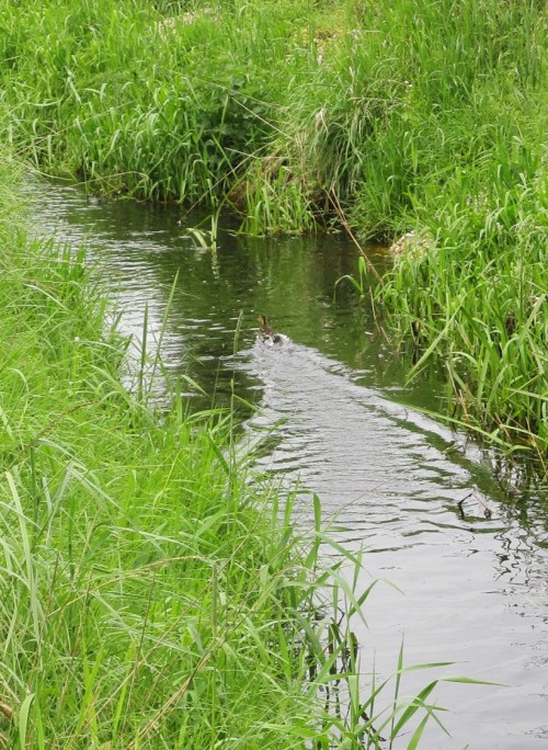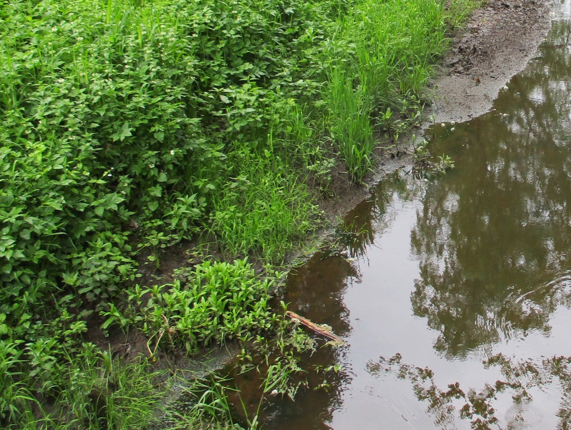 Eine nicht bearbeitete Teilstrecke – Wasserpest, sie macht ihrem Namen in übersonnten, untypisch still fliessenden Bach-Ruinen alle Ehre, setzt auf Übernahme der gesamten Bachbreite. Der Ruf nach Ausmähen wird folgen.
