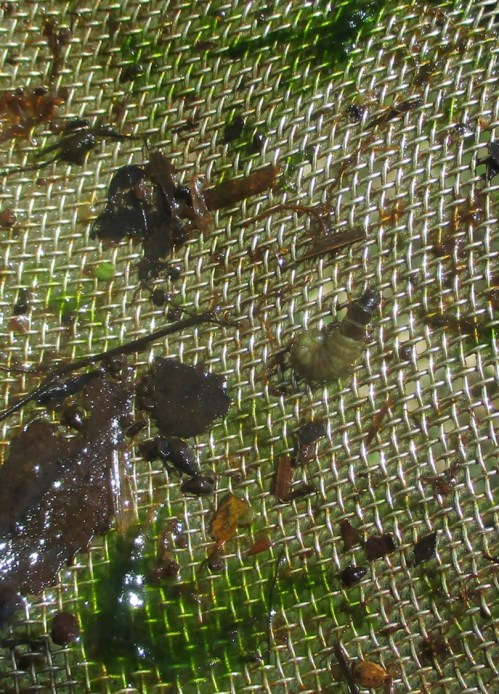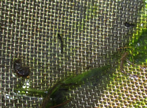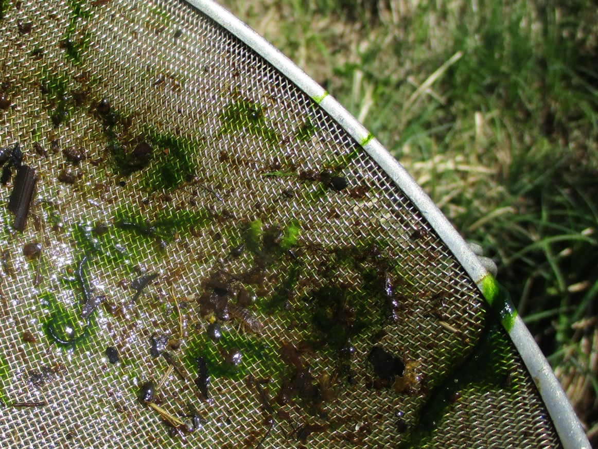 Die kleinen „Würmchen“ in der Schale sind mitgefangene, beim Siebausspülen nicht verloren gegangene Larven von Zuckmücken, Chironomiden. Diese sind eine weltweit in fliessenden und stillen Gewässern je nach Lebensraum arten- und individuenreich angepasste Insektengruppe – beim Arbeiten mit dem Haushaltssieb meist „übersehen“ (sie gehören nicht zum Spektrum der mit dieser Methode gesuchten Gruppen).