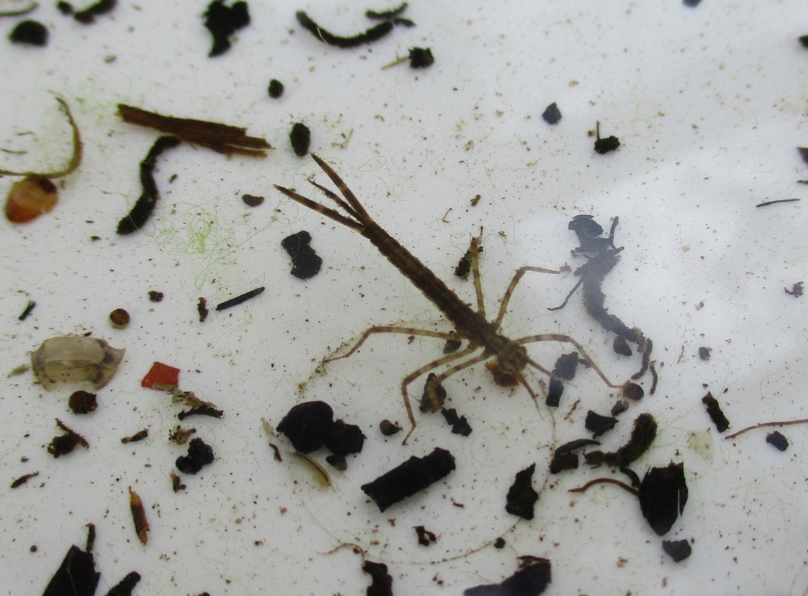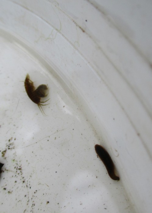 Auch hier der Bachflohkrebs und die Bauchansicht einer Libellenlarve Calopteryx.