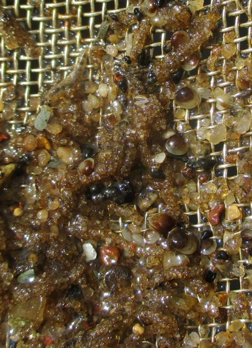 Beim Aussieben des hier in Teilen des Profils stabil liegenden Sandes bringt in Grobsand und Feinkies Larven der Großen Maifliege Ephemera (oben links eine einjährige, mit Glück wird sie Mai / Juni 2022 zum erwachsenen Insekt) und jede Menge Kleinmuscheln der Gattungen Sphaerium und Pisidium zutage.