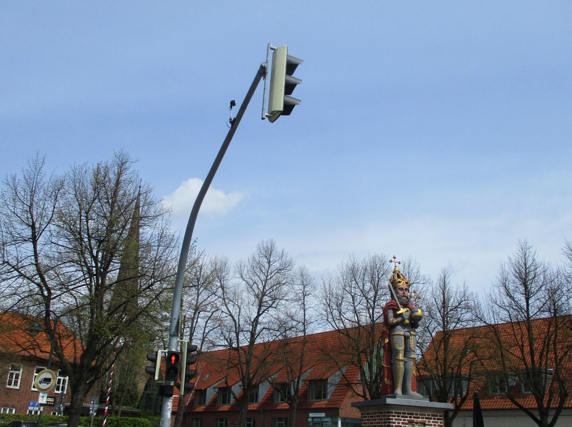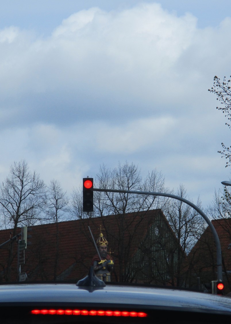 Sowas ist von Vorteil, wenn rechts ein ausladender Pkw – die Teile sind heutzutage ja reichlich seitwärts und längs gewachsen, geradezu ausgebeult – parkt. Und links lud genau so ein Großer. – Was für ein Schwachsinn in Zeiten, die zunehmend nach geringerem Energieverbrauch und Entblechen der Städte schreien. Man gerade, dass ich mich traute, zwischenrein zu fahren. Da die Boliden vorn etwas schräg voneinander weg standen, stehe ich nun ganz vorn. Da konnte ich sogar aussteigen.