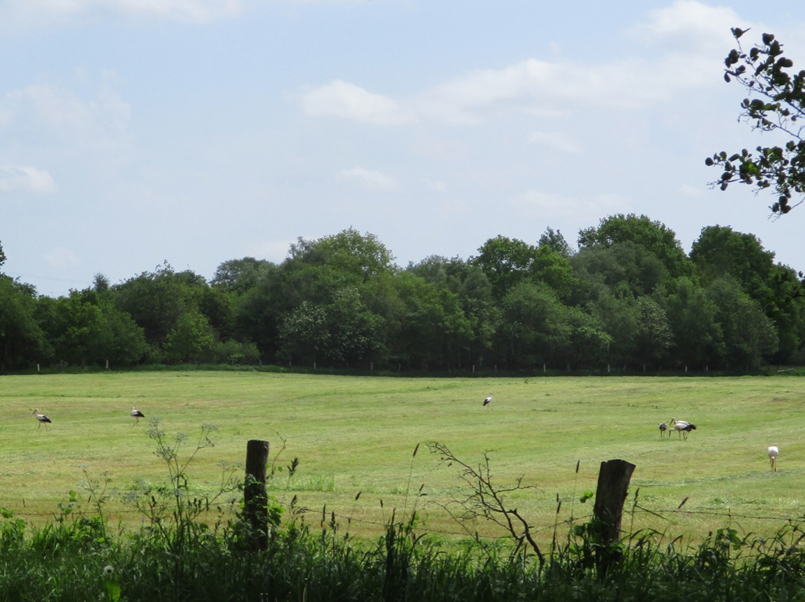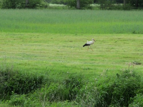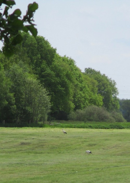 Die Störche haben sich auf der östlichen Mähwiese gesammelt, hinter Baumreihe, dicht an der Straße. Hier ziehen 3 ruhig, aber zügig ab.