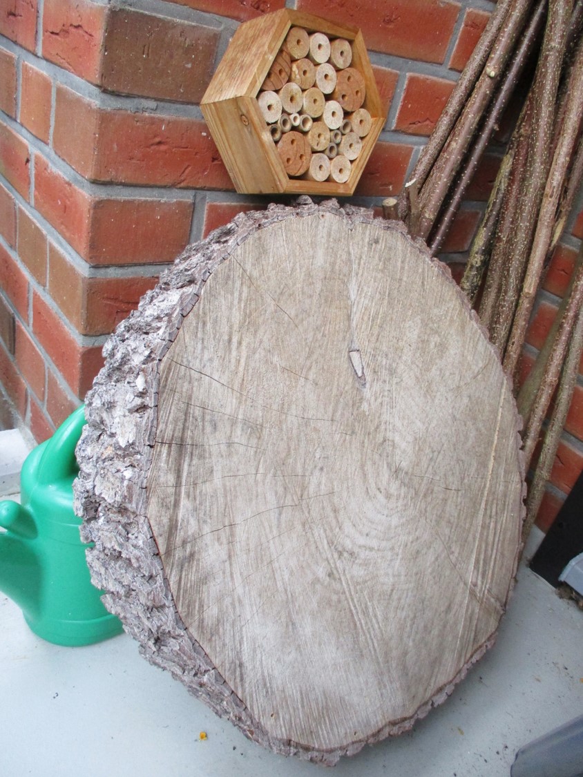 Juni 2021, inzwischen steht ein kleines Insektenhotel darauf, von dem bisher lediglich ein Brutrohr im Sommer 2020 genutzt wurde.