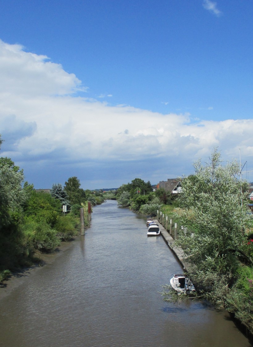 Wir blicken bachab von der Mühlenstraße Richtung Mühlenaumündung in die Pinnau, noch ein ganzes Stück weiter jenseits der Kurve.