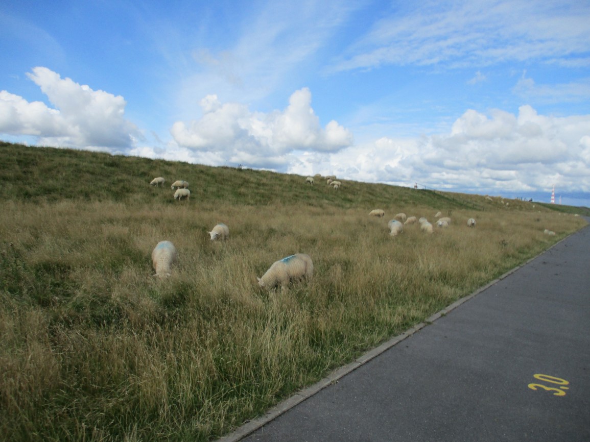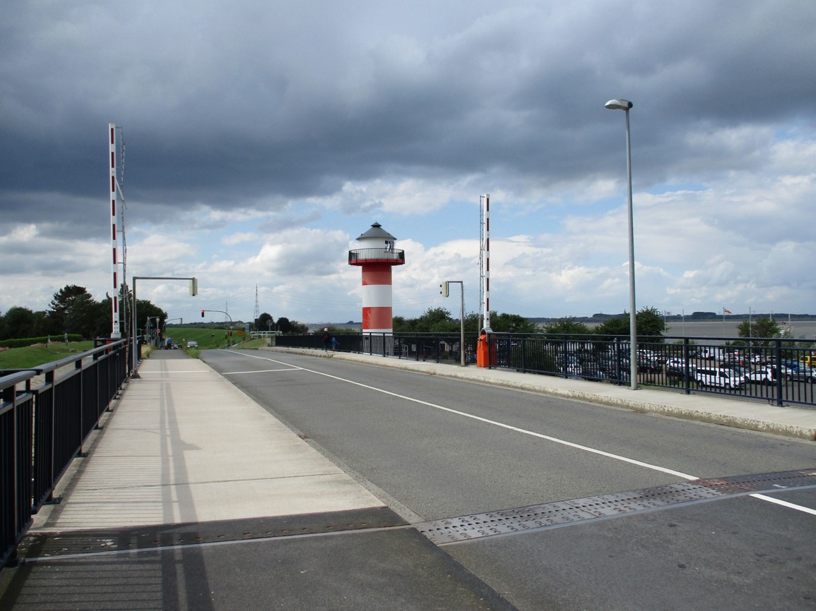 Pinnaubrücke Hindenburgdamm – der hier als tiefliegende Fläche gestaltete Kies ist durch die Überströmungswellen im „Dreieck“ links, obere Hälfte, erahnbar.