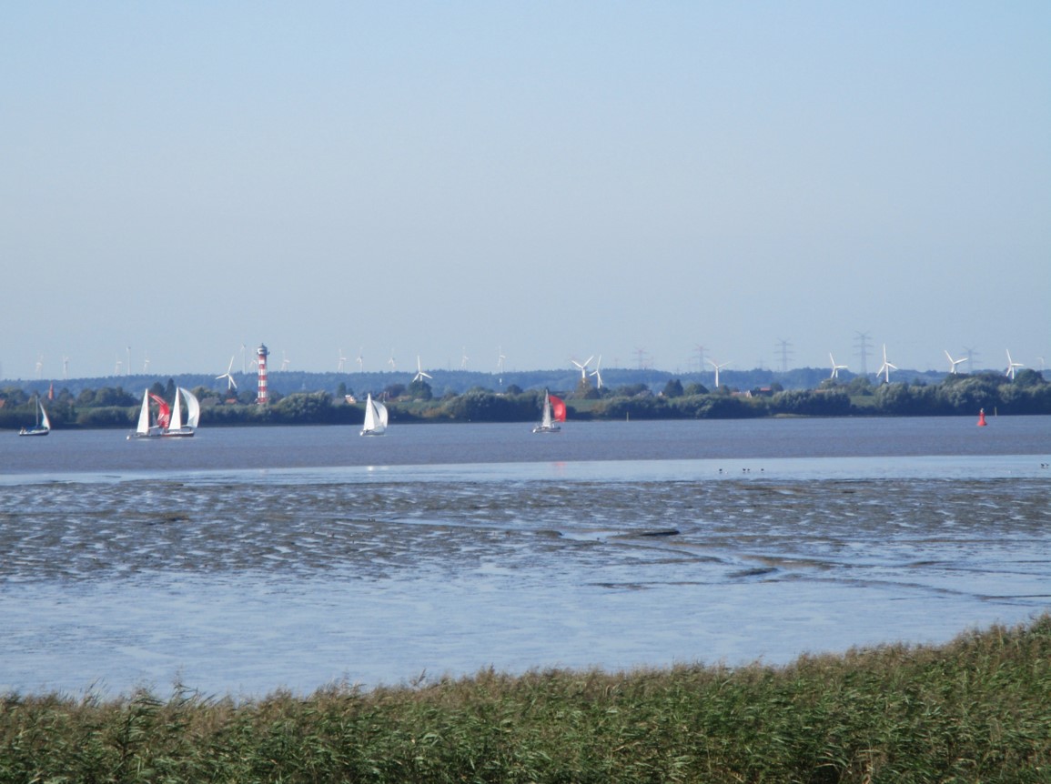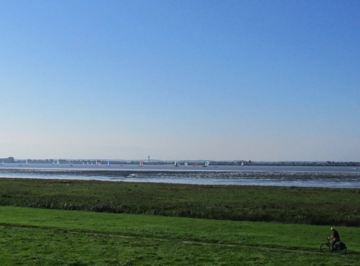 Blick gen Südost über das bei Ebbe freifallende Süßwasserwatt Fährmannssand – da hinten am Horizont ist was los, vorn quert ein früher Radler.