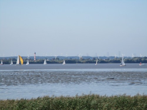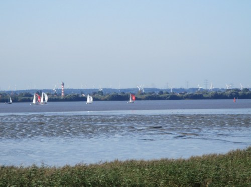 Da ich früh bin und mein Gesprächspartner noch nicht am Infostand anwesend ist, klettere ich auf den Deich. Warten in der Morgensonne mit Blick auf die Elbe ist ja nicht das Schlechteste, lohnt meist immer mit Aktuellem.