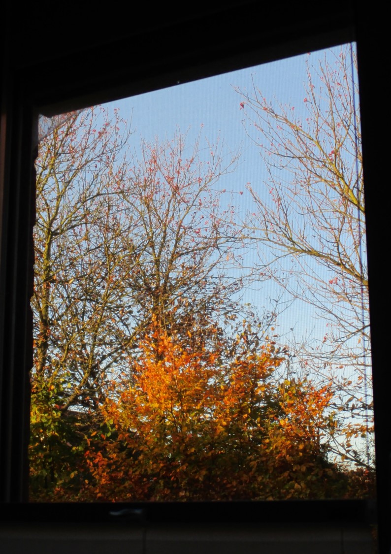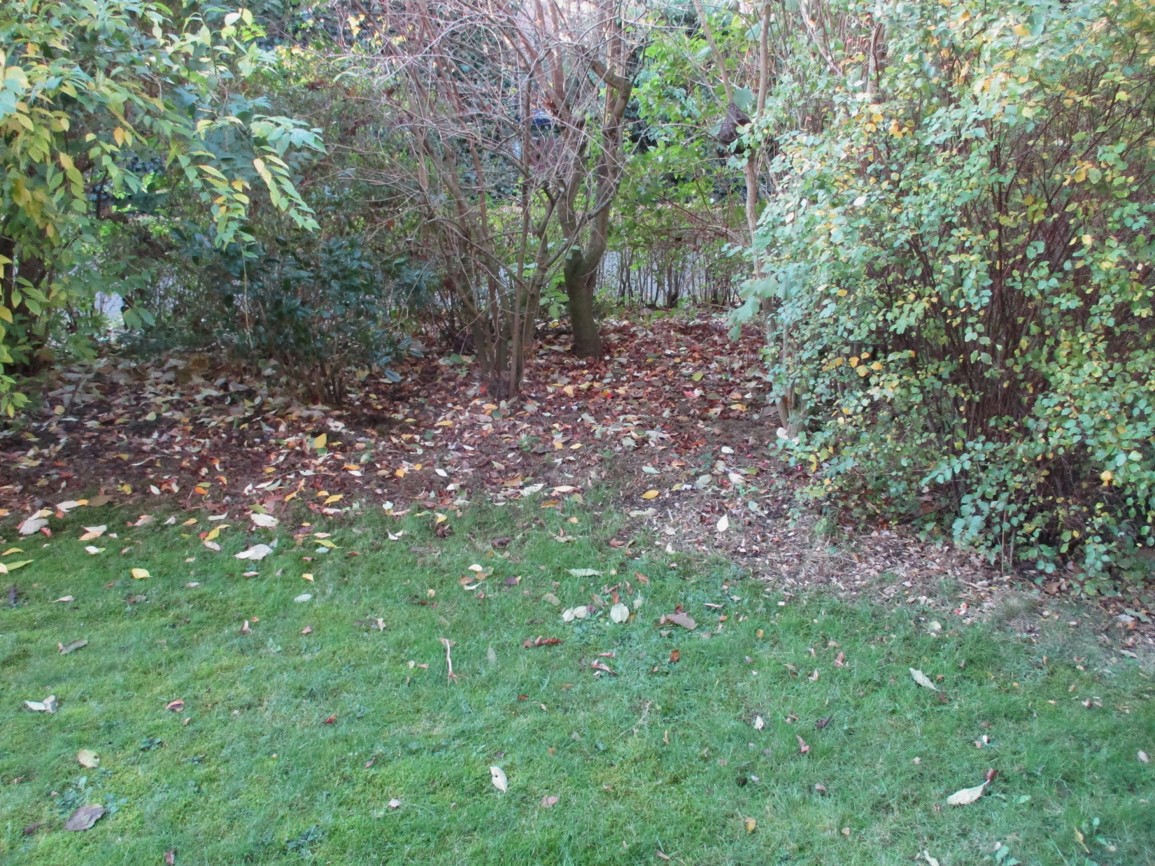 Unser Grün, aus dem Wohnzimmer gesehen, sieht aus wie gewünscht. Der Gärtner hat den Hinweis, Laub unter den Büschen liegen zu lassen und nicht durch „Ausblasen und Abschleppen“ Boden und Büsche zu schwächen, aufgenommen und realisiert.