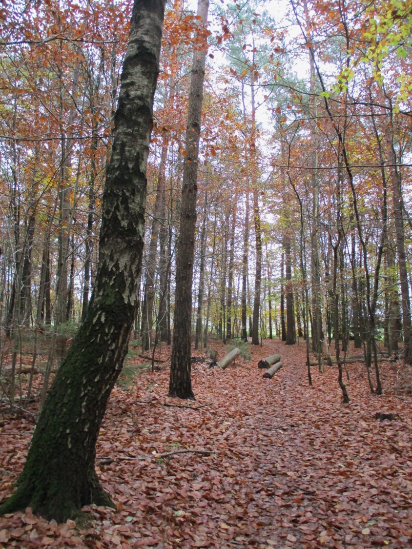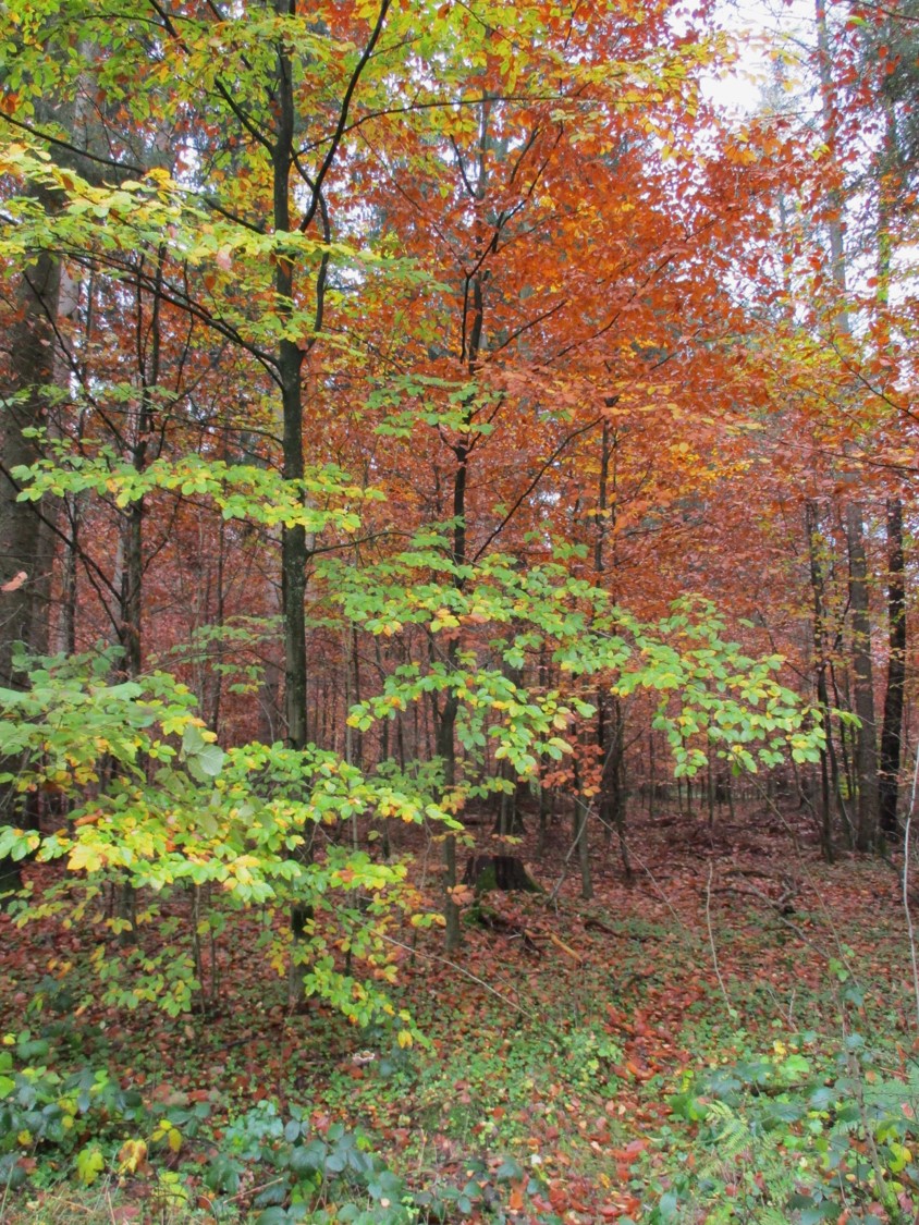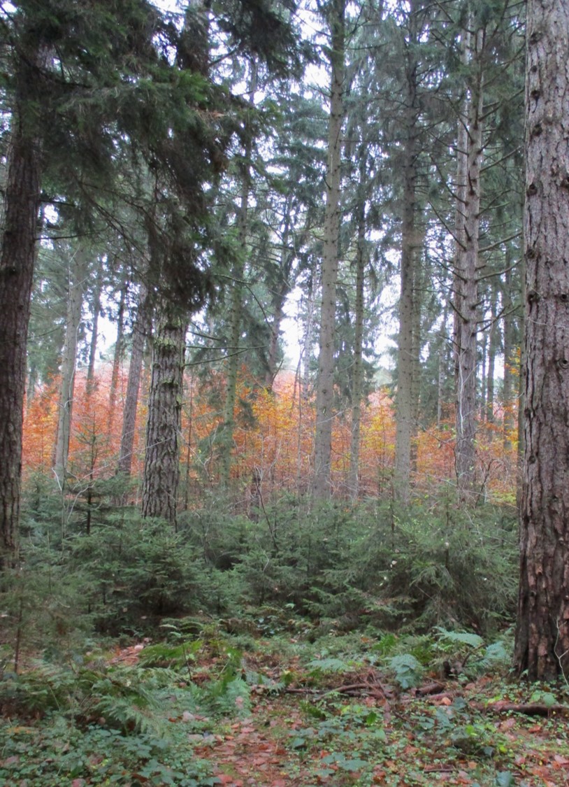 Die Waldpartien wechseln stark. Hier eine aufgelichtete Nadelwaldpartie, deren Boden bereits von Laub bedeckt wird.