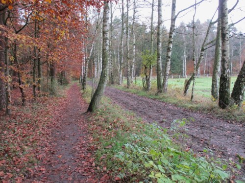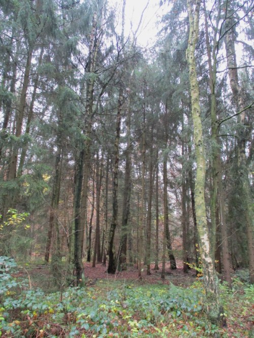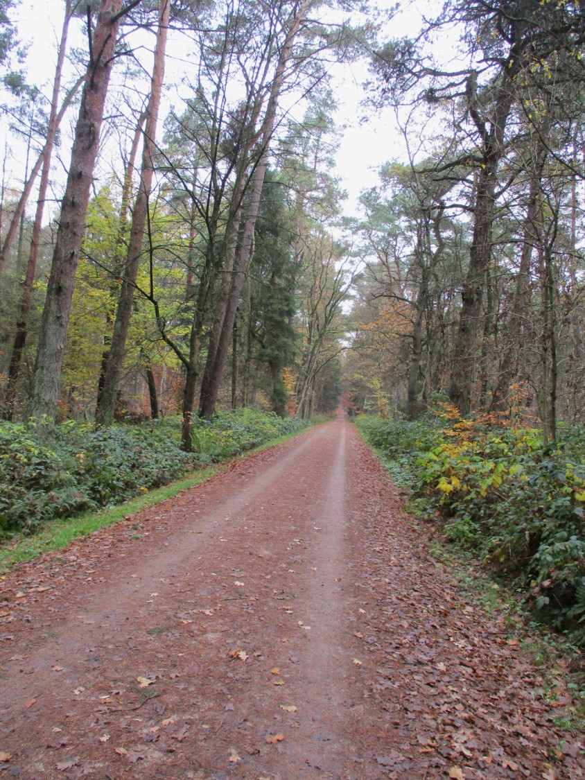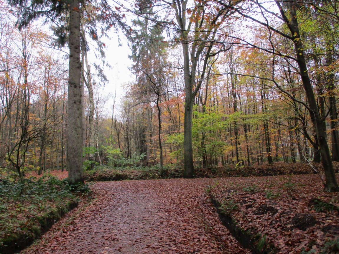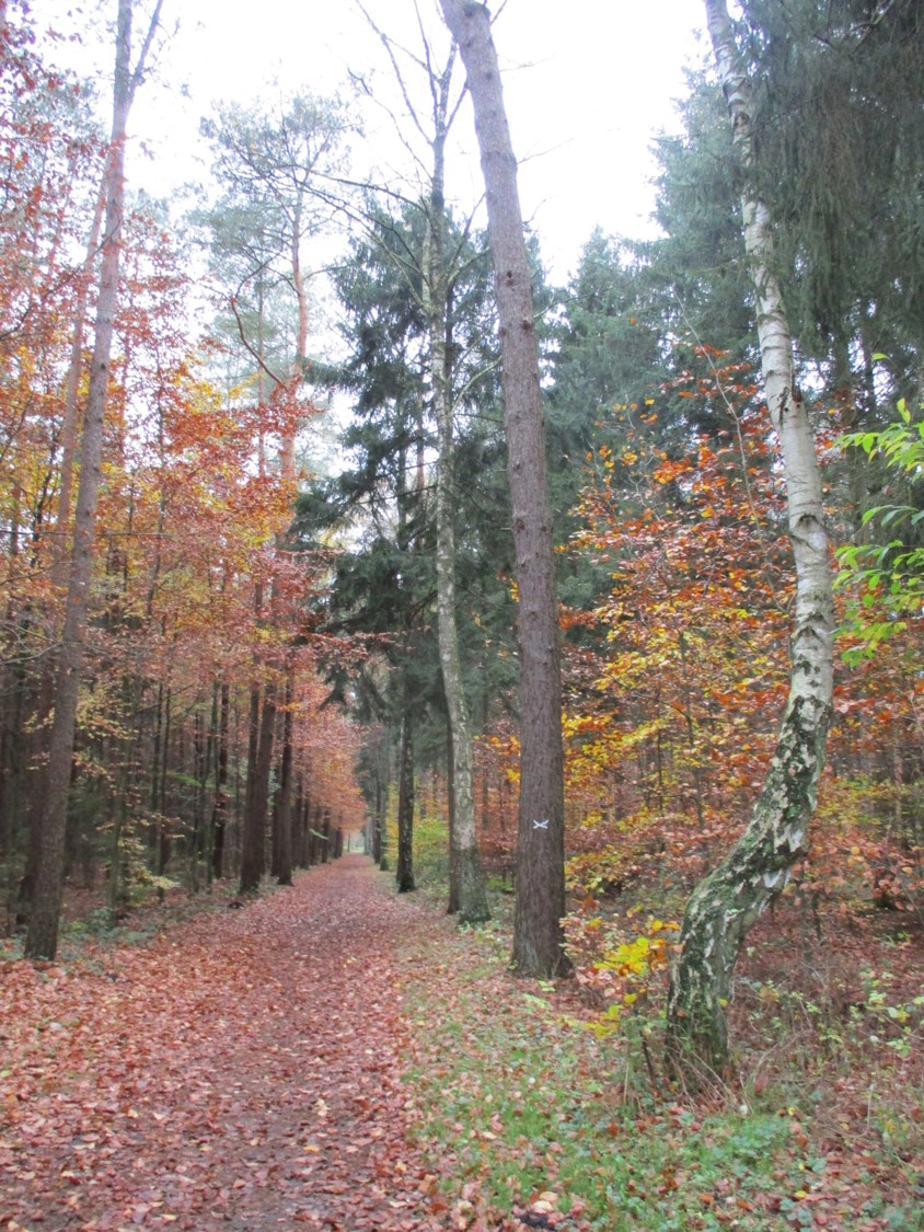 Die Waldpartien wechseln stark. Hier eine aufgelichtete Nadelwaldpartie, deren Boden bereits von Laub bedeckt wird.