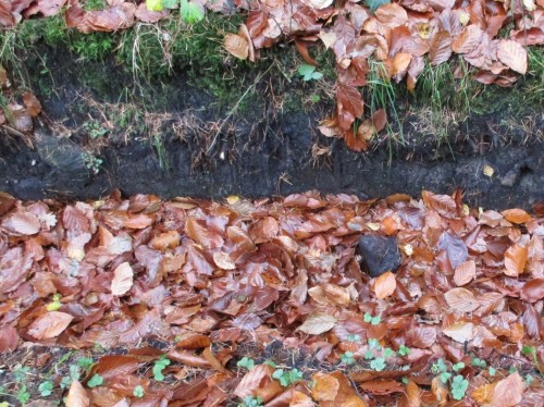 Nicht weit davon ist erkennbar, dass das Moor „weggearbeitet“ ist. Lehmige Moräne ist darunter angeschnitten, ein faustgroßer Stein hat sich herausgelöst.