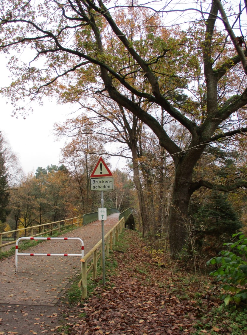 Da die L 103 den Ort vom Moor trennt, bietet sich hier eine Fußgängerbrücke. „Brückenschäden“, na ja, was ich vor 2 Jahrzehnten durch Kontakte in entsprechende Kreise wusste und nicht berichten durfte, ist inzwischen öffentlich. Mehr als 3.000 Brücken wurden durch jahrzehntelanges Verschlunzen in nicht mehr akzeptable Schäden „entwickelt“. Die zunehmende Zahl an Baustellen, Sperrungen, Umleitungen zeigt bei Prioritätsfällen, wie weit wir damit inzwischen sind … Hoffentlich stürzt da nicht zwischendrin was ein, womöglich mit Schaden an Menschen! – Diese Fußgängerbrücke hat bei sachgemäßer Nutzung sicherlich noch ein Bisschen Zeit.